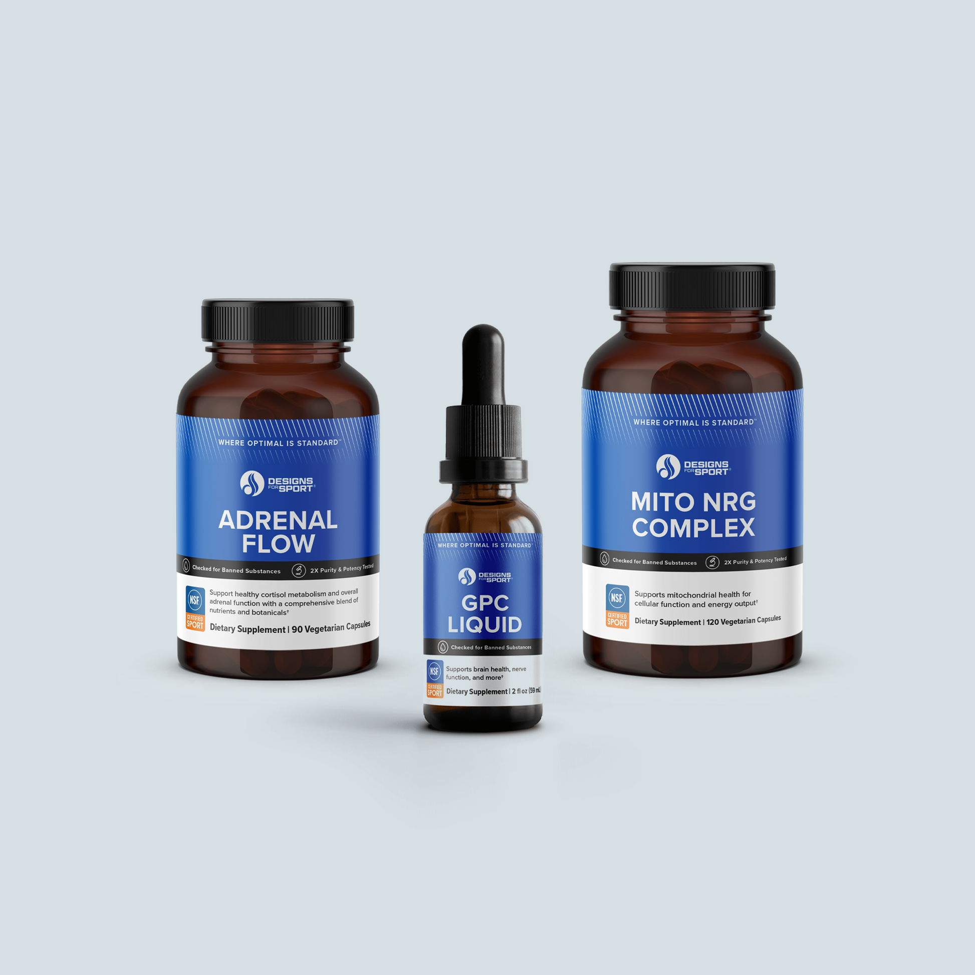 Power through long practices and demanding training sessions with the Energy & Focus Stack.* This combination features Adrenal Flow to support a healthy stress response and adrenal function, GPC Liquid for mental focus and brain health, and Mito NRG Complex to promote cellular energy (ATP) production for sustained vitality.* Together, these supplements provide foundational support for athletes, coaches, and trainers to help them perform at their best, both mentally and physically.*