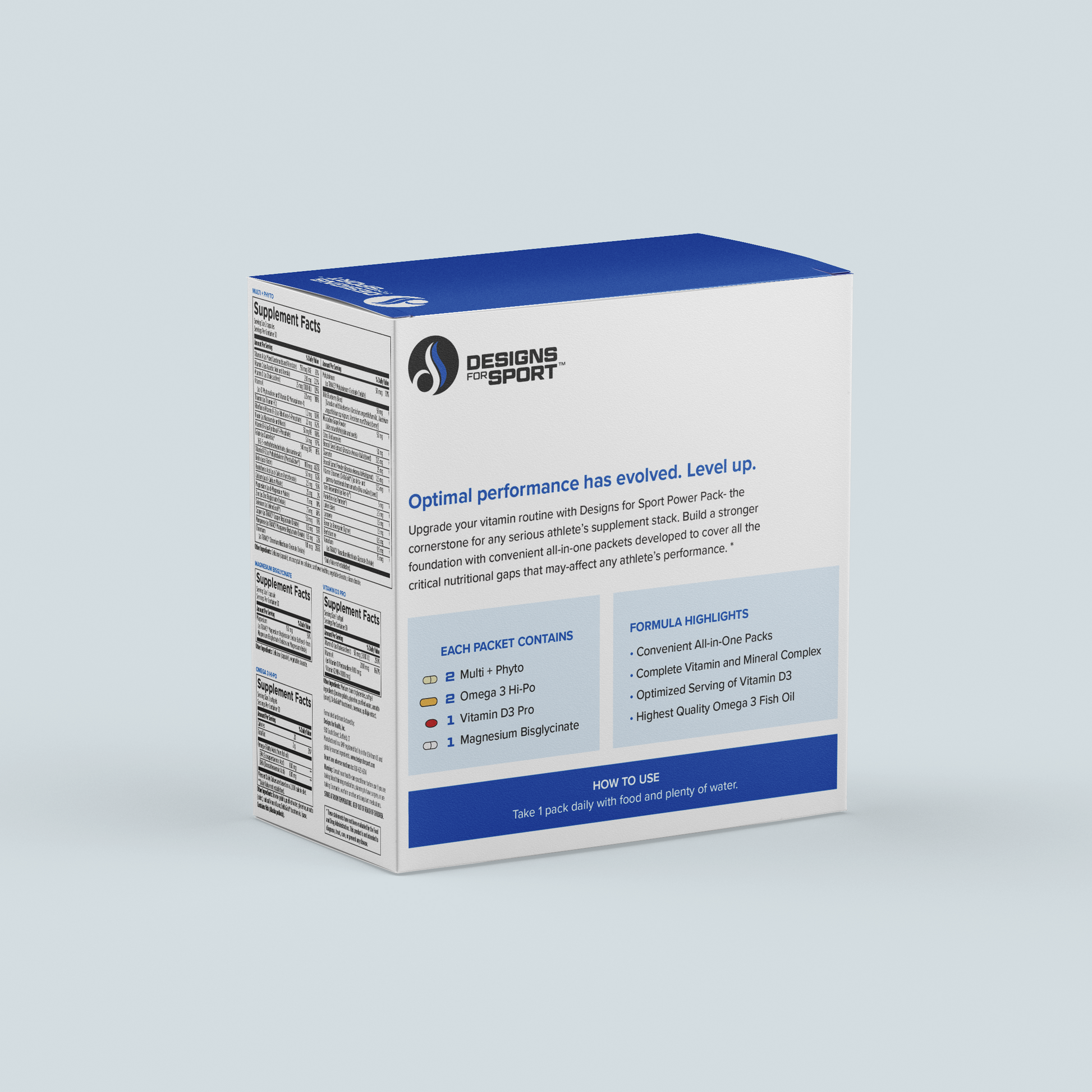 Upgrade your vitamin routine with Designs for Sport™ Power Pack - the cornerstone for any serious athlete’s supplement stack. Build a stronger foundation with convenient all-in-one packets developed to cover all the critical nutritional gaps that may affect any athlete’s performance. Each packet contains: 1 x Magnesium Bisglycinate, 1 X Vitamin D3 Pro Softgel, 2 x Omega-3 Hi-Po and 2 x Multi + Phyto.